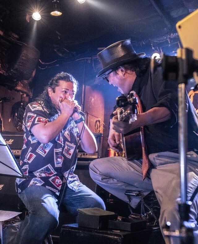 日本でもトップクラスのブルースギタリスト岩下潤と日本一のハーモニカプレイヤー皆川和義。